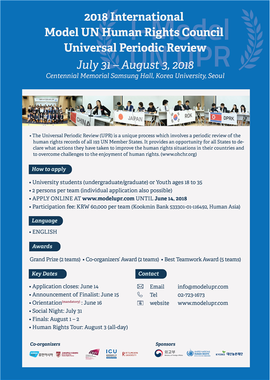 고려대학교 인권센터(센터장 서창록, 고려대학교 국제대학원 교수, 사단법인 휴먼아시아 대표 및 유엔 인권이사회 자문위원회 위원)는 7월 31일(화)부터 8월 3일(금)까지 고려대 백주년기념관 국제원격회의실에서 ‘2018 국제 모의 유엔 인권이사회 UPR’을 개최한다.