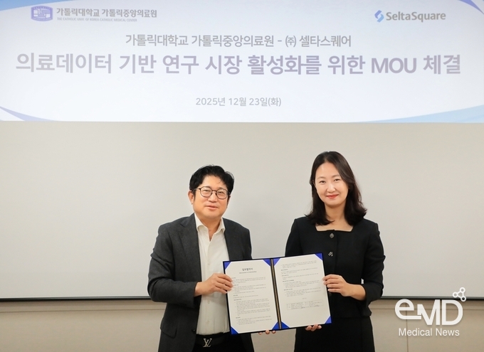 가톨릭대학교 가톨릭중앙의료원 정보융합진흥원(원장 김대진 교수)이 12월 23일(화) 오전 10시, 정보융합진흥원 다목적세미나실에서 ㈜셀타스퀘어(대표 신민경)와 의료데이터를 활용한 연구 활성화와 사업 협력을 위한 업무협약(MOU)을 체결했다.