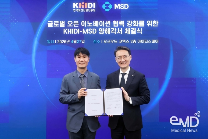 한국MSD는 한국보건산업진흥원과 2026년 4월 27일 오전 오크우드 프리미어 코엑스 센터(서울시 강남구)에서 오픈 이노베이션 협력 강화를 위한 양해각서(MOU)를 체결했다.