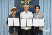 강원대학교병원(병원장 남우동)이 임근우 화백(강원대학교 미술학과 명예교수), 전통공예품 제작사 디자인조선(대표 이두은)과 협업하여 굿즈 제작에 나선다. 강원대병원은 지역미술과 전통예술을 잇는 콜라보 굿즈 제작을 위해 임 화백, 디자인조선과 업무협약을 20일 체결했다. 임근우 화백은 홍익대학교 미술대학을 졸업하고 강원대학교 미술학과 교수를 지낸 춘천 출신 대표 서양화가이다. 임 화백은 강원대병원의 특색있고 뜻깊은 굿즈 제작을 위해 흔쾌히 협업에 참여했다. 오는 9월 10일 서울에서 열리는 본인의 개인전에서도 콜라보 굿즈를 활용한 작품을 별도로 선보일 예정이다. 협업 제작사로는 디자인조선이 함께한다. 디자인조선은 전통적인 나전칠기공예 기법을 재현하여 현대적으로 재해석한 공예품을 제작하고 있다. 디자인조선은 최근 선풍적인 인기를 끌고 있는 국립박물관 문화상품 ‘뮷즈’와도 협업하고 있다. 강원대병원은 임 화백, 디자인조선과 함께 시범으로 명함집과 컵받침을 제작했다. 건강과 행복을 상징하는, 임 화백의 시그니처 ‘복숭아 꽃을 머리에 피운 무릉도원의 이상동물’이 디자인조선의 나전칠기 공예 기법으로 재탄생했다. 강원대병원은 시범으로 제작한 명함집과 컵받침 외에도 협약을
