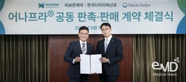 ● 계열 내 최초(first-in-class)국산 신약 어나프라®, 중등도 이상 수술 후 통증에 효과 입증1,2 ● 10월 중 국내 시판 시작, 양사 협력 통해 의료현장 내 접근성 높여나갈 것 한국다이이찌산쿄주식회사(대표이사 사장 김정태, 이하 한국다이이찌산쿄)와 주식회사비보존제약 (대표이사장부환, 이하 비보존제약)은 지난 15일 비마약성 진통제‘어나프라®(성분명 오피란제린염산염)’의 국내 공동 프로모션 계약을 체결했다. 이번 계약에 따라 한국다이이찌산쿄는 비보존제약이개발한 어나프라®에 대한 국내 유통 및 판촉을 공동으로 담당하게 된다.한국다이이찌산쿄는 비보존제약으로부터완제품 형태의어나프라®를 공급받아 300병상 이상의 종합병원을 중심으로유통과 영업 및 마케팅 영역에서 역할을분담한다. 어나프라®는 지난해 12월 식품의약품안전처로부터 38번째 국산 신약으로 허가 받은[i] 계열 내 최초(first-in-class) 비마약성통증치료제로,[ii]‘성인에서 수술 후 중등도에서 중증의 급성통증 조절을 위한 단기요법’으로 승인되었다.1 글라이신수송체 2형(GlyT2)과 세로토닌 수용체 2A형(5-HT2A)을 동시에 억제하는 새로운기전으로 중추신경계와말초신경계에서 통증