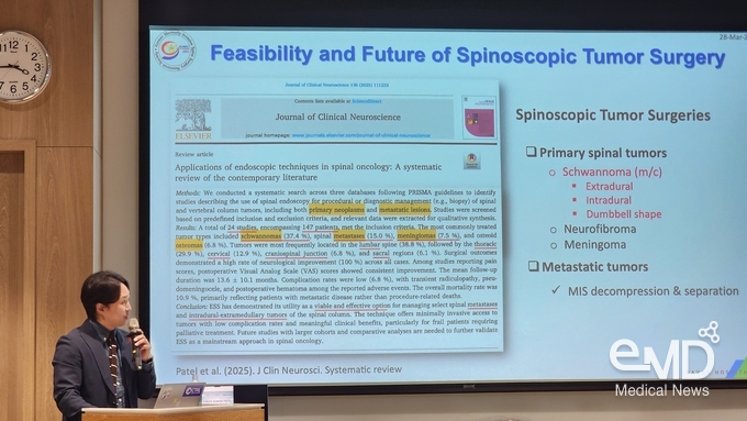 이번 발표에서는 특히 경추 아령형 신경초종(cervical dumbbell-shaped schwannoma)에 대한 내시경 수술을 세계 최초로 시행한 사례가 소개돼 학계의 주목을 받았다. 이는 척추 종양이라는 고난도 영역에서 아직 널리 시도되지 않았던 내시경 기반 최소침습 수술을 선도적으로 적용하고, 실제 임상적 성과를 입증했다는 점에서 의미가 크다. 또한 국내 의료진의 높은 기술력과 풍부한 임상 경험을 국제 무대에 알린 자리로 평가된다.