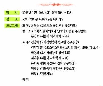 10월 20일 국회에서 ‘호스피스완화의료 및 연명의료 제도’ 대토론회 개최
