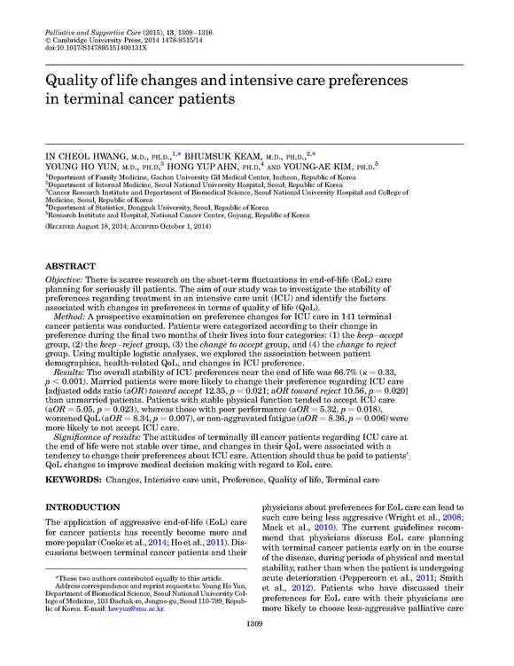 서울대학교병원 암통합케어센터 윤영호, 혈액종양내과 김범석 교수는 가천대학교길병원 가정의학과 황인철 교수, 국립암센터 연구팀과 함께 이 결과를 국제 저명 학술지 ‘Palliative and Supportive Care’ 10월호에 발표했다.
