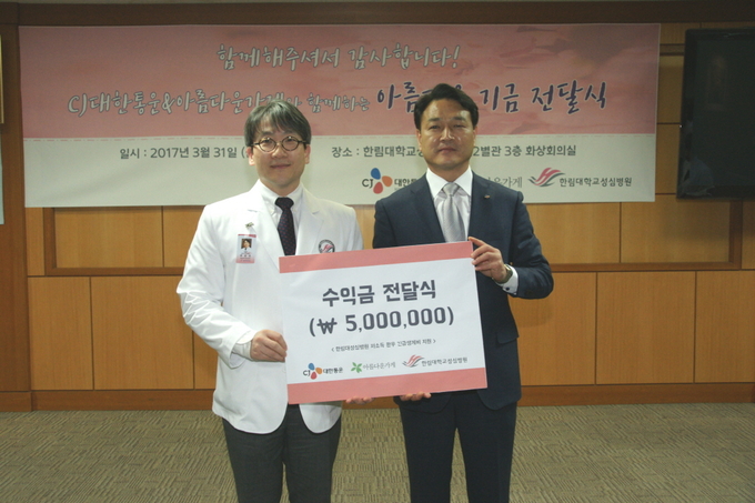 아름다운 기금은 지난 2월 한림대학교성심병원, CJ대한통운, 아름다운가게가 개최한 ‘아름다운 행사’의 수익금 500만원이다. CJ대한통운이 기증한 무적화물을 아름다운가게(안양점)가 판매해 수익금을 얻었다.