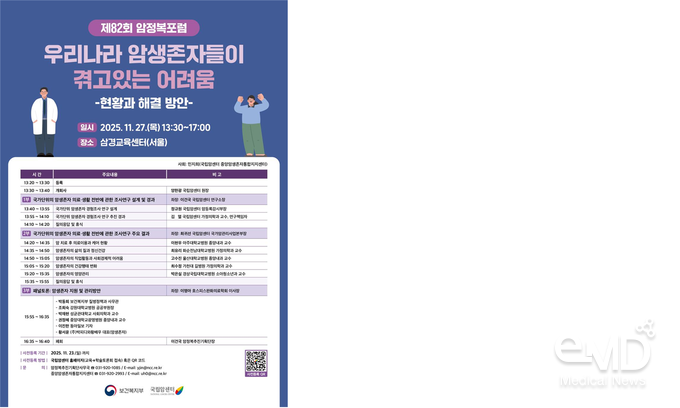 국립암센터(원장 양한광)와 암정복추진기획단(단장 이건국)은 ‘우리나라 암생존자들이 겪고 있는 어려움, 현황과 해결방안’을 주제로 오는 11월 27일(목) 13시 30분 서울 삼경교육센터에서 제82회 암정복포럼을 개최한다.