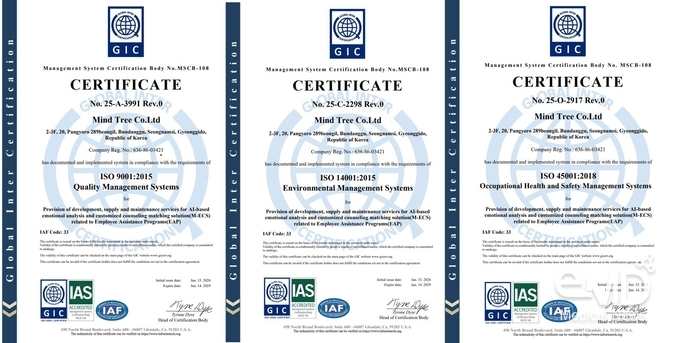 이번에 마인드트리가 획득한 인증은 ISO 9001(품질경영시스템), ISO 14001(환경경영시스템), ISO 45001(안전보건경영시스템) 등 3개 분야를 모두 포함한다. 인증 범위는 기업 및 기관 대상 EAP 관련 AI 기반 정서 분석 및 맞춤형 상담 매칭 솔루션(M-ECS)의 개발·공급·유지관리 서비스다.